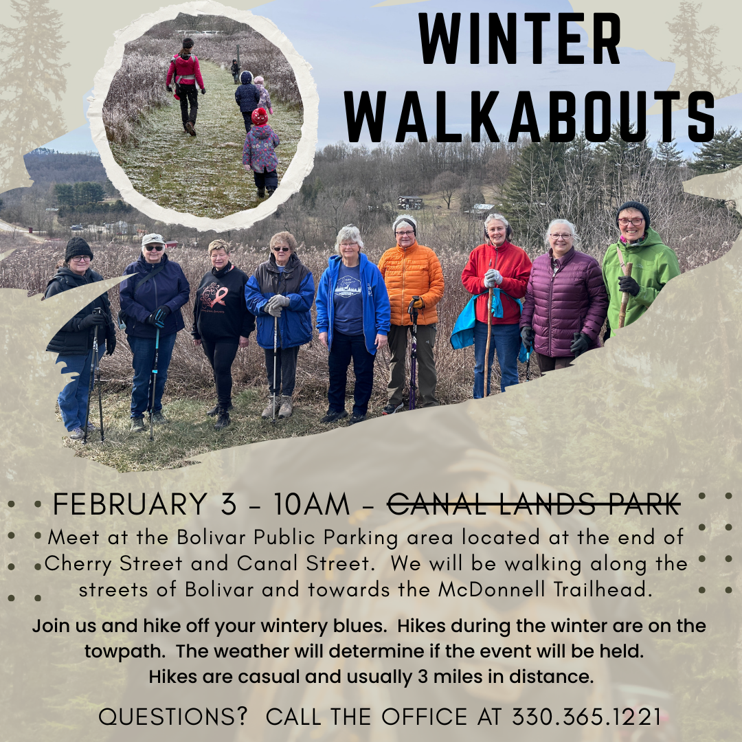 Program Update: The meeting and walking spot for the Winter Walkabout for February 3rd is changed to downtown Bolivar and heading down the towpath trail towards the McDonnell trail. Parking and the meeting spot will be in Bolivar at the end of Cherry Street and Canal Street. The Bolivar public parking area is marked by a public parking sign and down the street from the Towpath Tavern. We will be meeting at 10AM. Dress warm and for the weather.